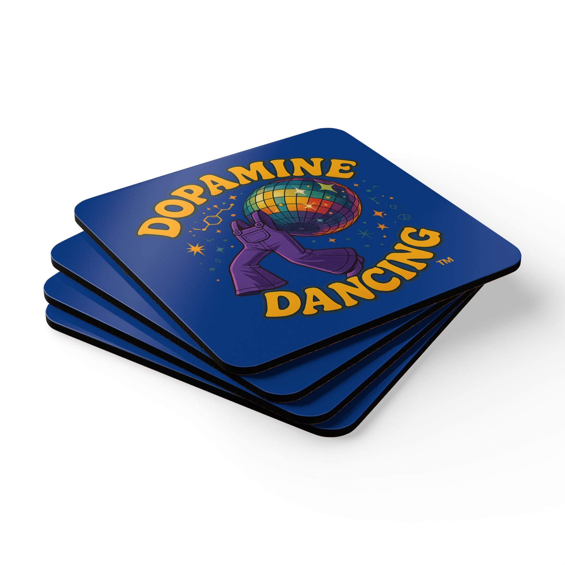 Dopamine Dancing Corkwood Coaster Set, Fun Drink Coasters, Unique Gifts for Unicorn Lovers, Home Decor, Party Supplies, coloured text on white