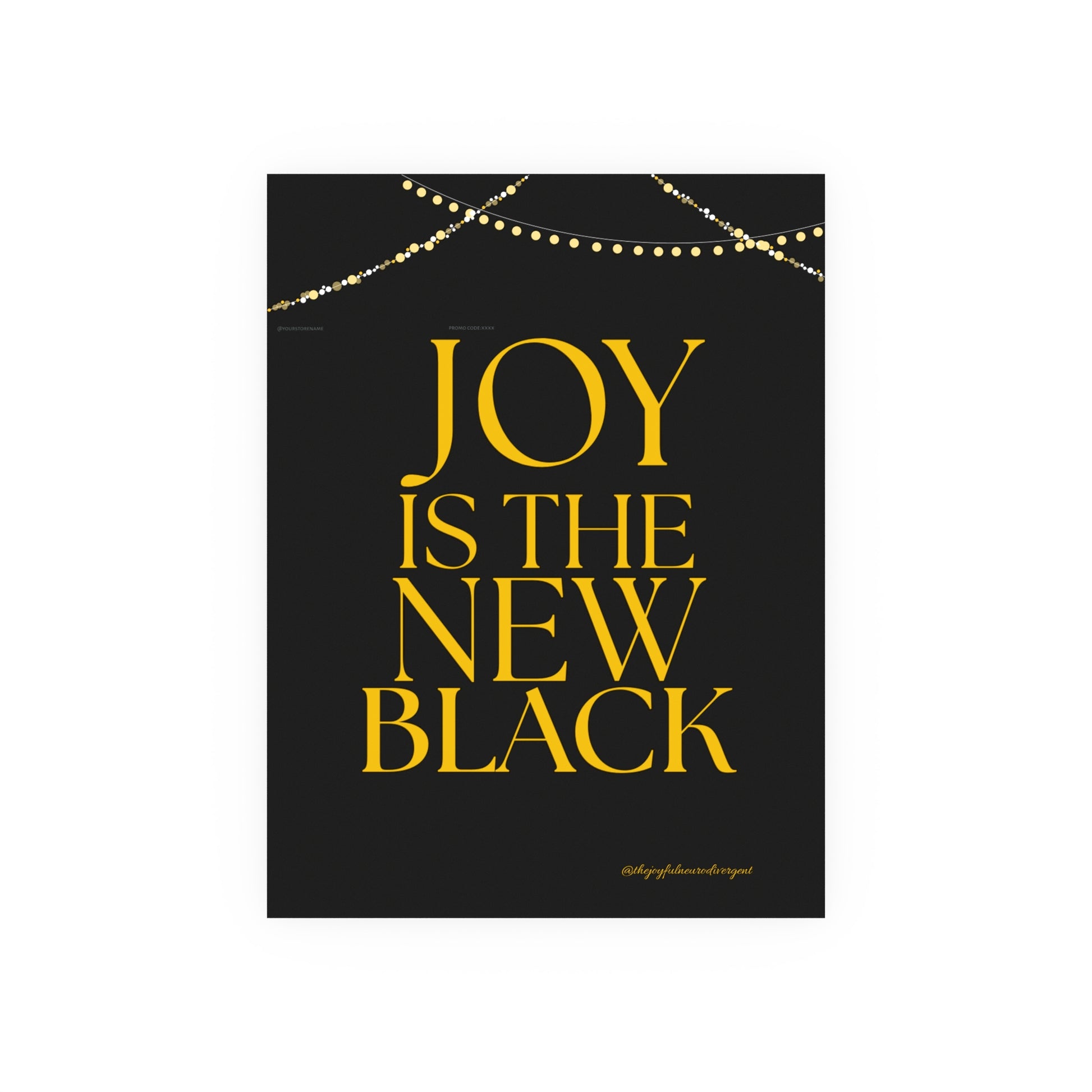 Elevate your space with this 18 x 24 matte poster featuring 'Joy is the new black' in gold text on a black background. It adds a touch of sophistication and positivity to any room, perfect for those who appreciate modern design and motivational quotes. Ideal for gifting on birthdays, graduations, or as a thoughtful reminder during challenging times.