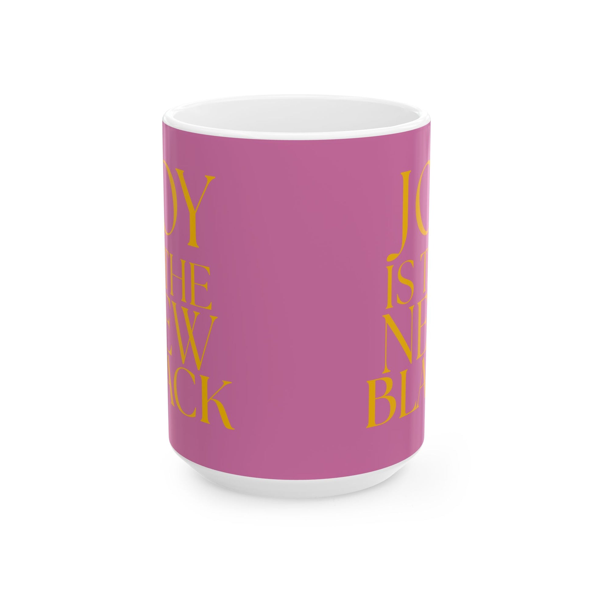 Joy is the New Black' 15 oz Ceramic Mug, Gold text on Pink background