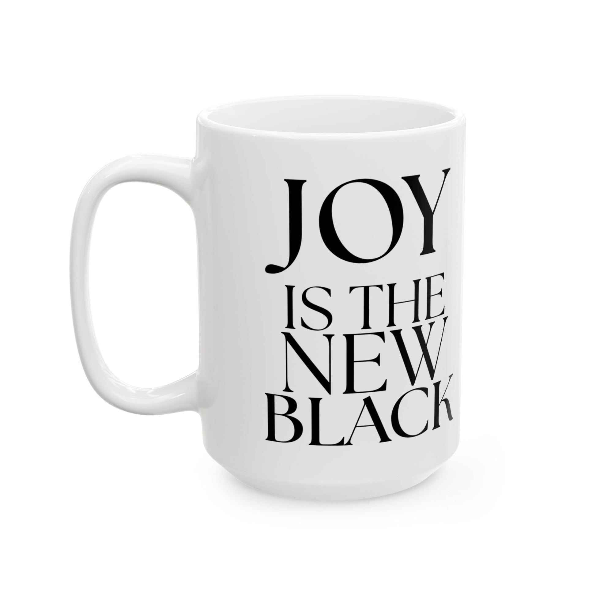 This 15 oz ceramic mug with the quote 'joy is the new black' exudes positivity and modern style. Perfect for morning coffee or tea, this mug is a great way to start your day on a bright note. Ideal for those who appreciate uplifting messages and want to add some cheer to their daily routine. Relevant for gift-giving during birthdays, holidays, and special occasions.